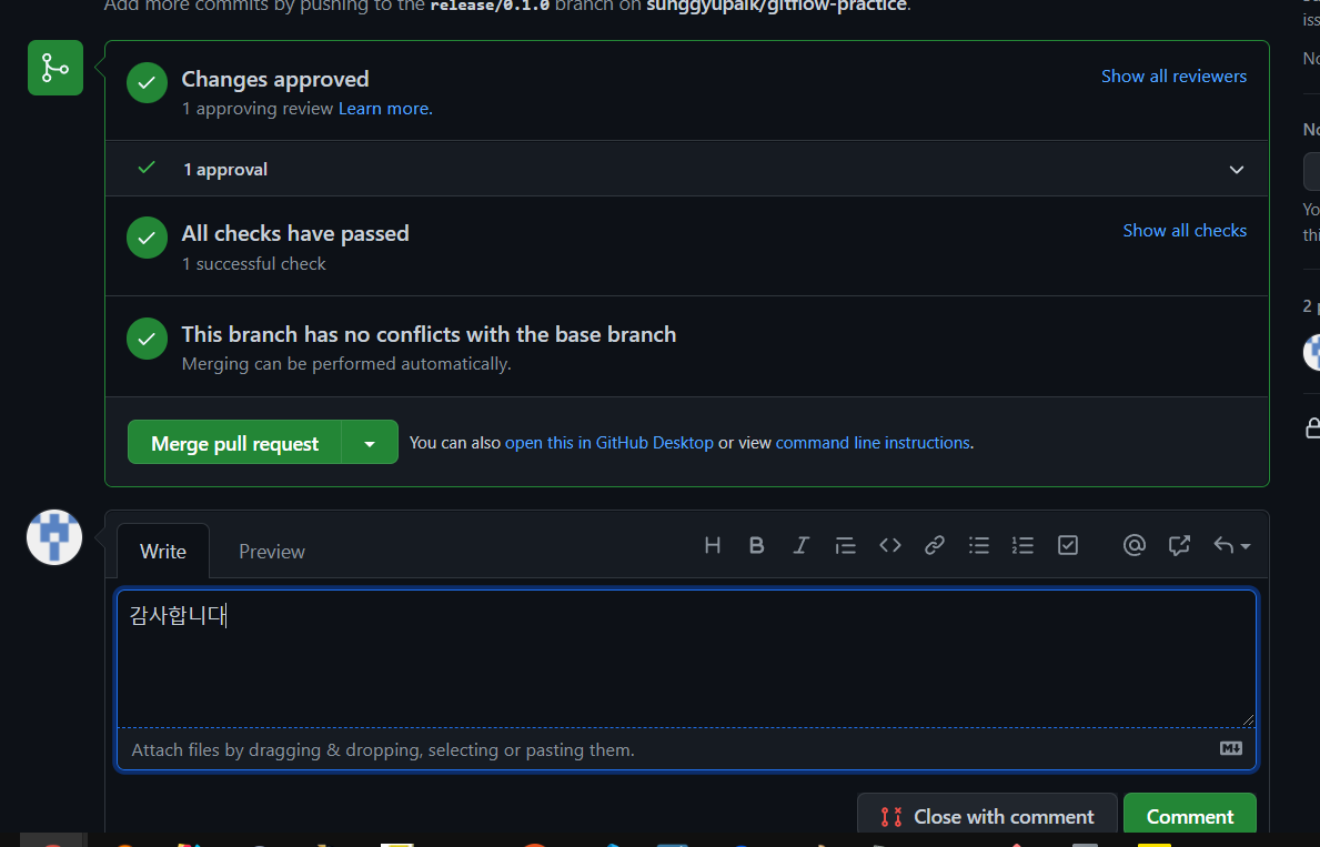 역시나 pull request를 날렸다면, 리뷰를 통해 Approve를 확인받습니다.