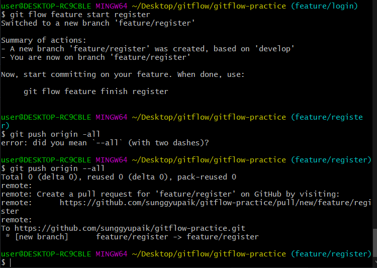 이제 feature/register 기능을 모두 종료합니다. origin repository에 push 합니다.