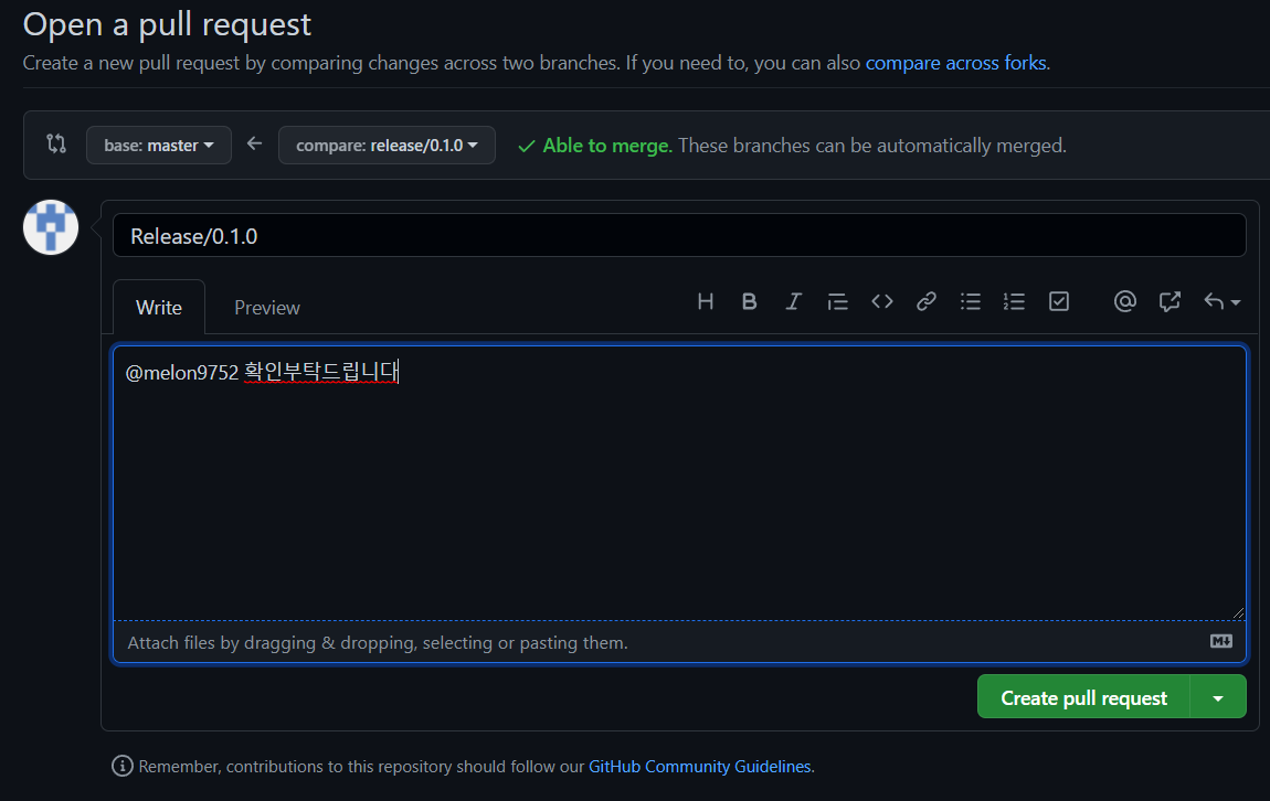 release를 반영해야 하기 떄문에 release/0.1.0을 master에 pull request를 요청합니다.