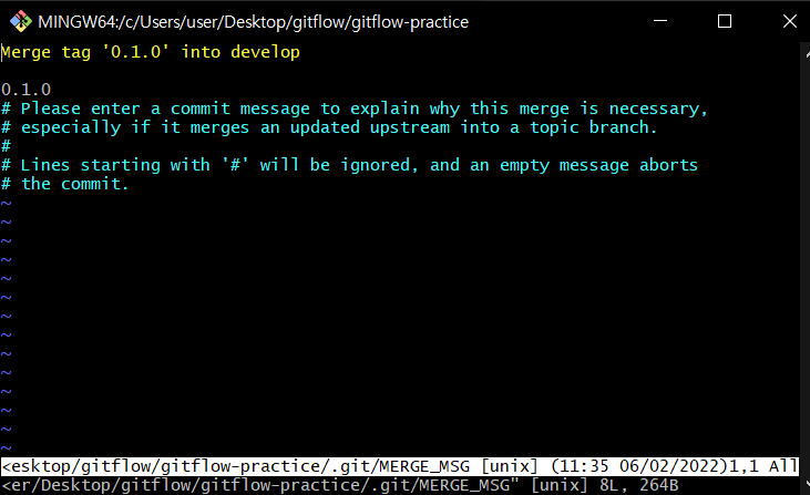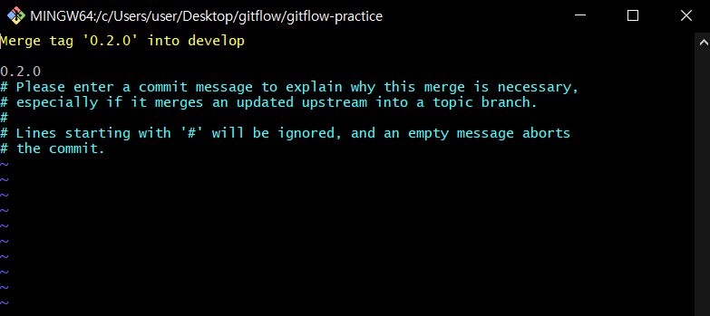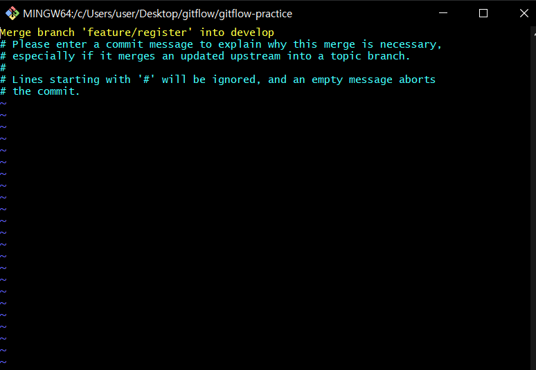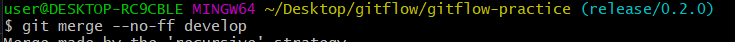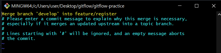 feature를 종료하면 다음과 같이 자동으로 develop에서 merge를 하며, 메시지를 입력합니다
