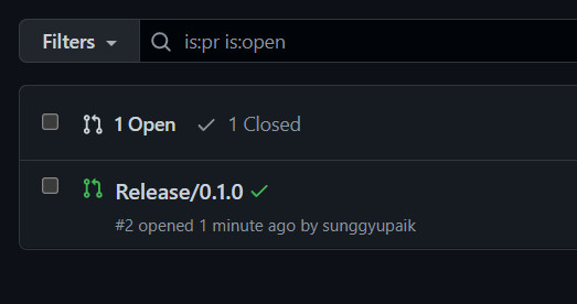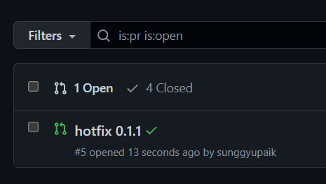 pull request 목록에 가면 다음과 같이 초록색 아이콘을 가진 게시글로 나옵니다.