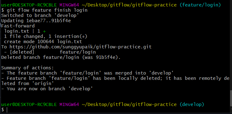 이제 로그인 기능 구현이 모두 끝나고 승인을 받았습니다. 따라서 승인을 받았다면, branch를 종료하면 됩니다. 종료가 되면, local repository에는 feature/login branch가 사라지고, 해당 내용이 develop에 merge가 됩니다. 또한 현재 branch가 feature/login이 삭제되었으므로 develop으로 이동합니다.