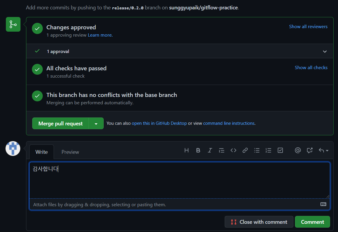 리뷰가 완료되면, pull request를 날린 사용자는 merge하지 않고 close를 합니다.