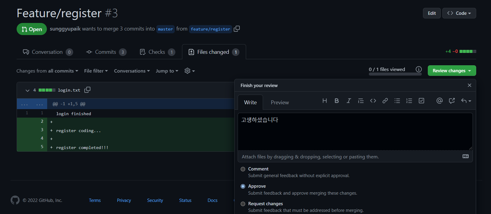 일반적으로 pull request는 develop에 요청을 하기 때문에 왜 master에 하는지 의문이 들 수 있습니다. 이는 다양한 전략을 가져가는 방법 중 하나인데, 당연히 master에서 바로 merge하지 않습니다. approve를 하고, merge하지 않은 상태에서 close를 할 예정입니다. Review changes에서 Approve를 선택하고 리뷰를 남깁니다