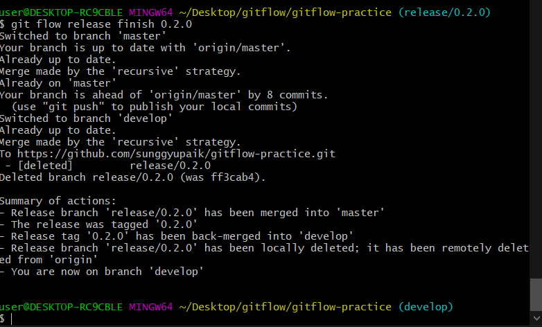 이제 register 기능이 추가된 develop을 배포하고 싶습니다. 그래서 release를 새로 0.2.0으로 생성하고 origin repository에 push합니다.