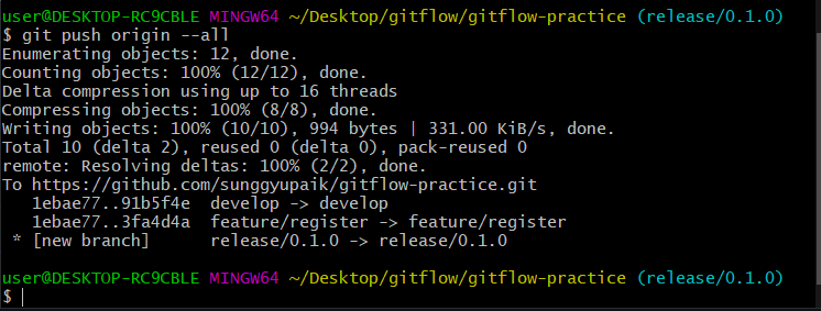 local repository에서 했던 작업을 origin repository에 push합니다. 현재, release와 feature/register의 2개가 push됩니다.