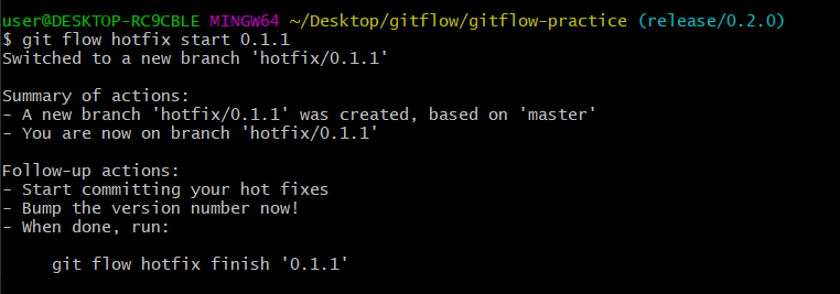 release를 finish하고 master, develop에 반영하기 전에 문제가 발생했습니다. 현재 배포된 버전은 0.1.0으로 hotfix가 필요한 상황입니다. 새로운 hotfix를 생성합니다.