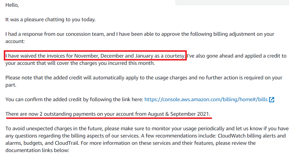 그렇게 여러번 이메일을 주고받았는데 결국 11, 12, 1월 청구금액을 모두 면제해준다고 합니다!!!