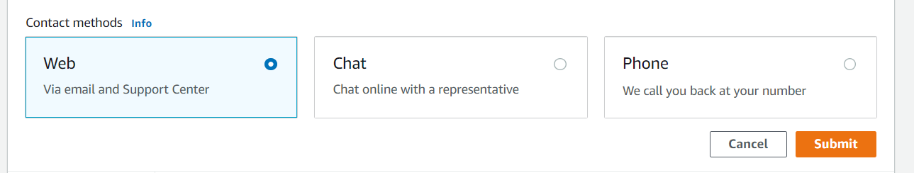 총 3가지 응답을 받을 수 있는데 첫번째 Web(이메일), 두번째 Chat(실시간 상담원 연결), 세번째 Phone(핸드폰) 중에 Web으로 문의했습니다.