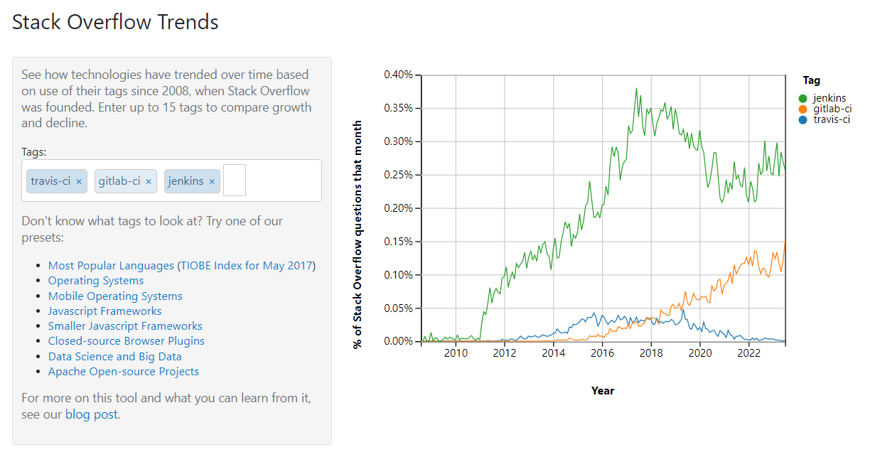 다음은 stackoverflow에서 트렌드를 검색했습니다. 검색어에 제한이 있긴 하지만, Jenkins의 토론이 압도적으로 많습니다. 최근에 Jenkins가 다소 주춤했으며, GitLab CI가 꾸준히 상승하고 있습니다.