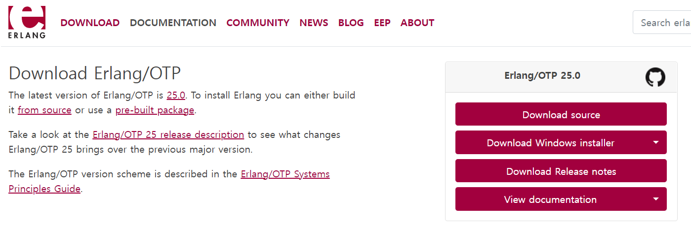 Windows 환경에 rabbitMQ를 설치하려면 먼저 Erlang이 설치되어 있어야 한다. 아래 사이트에서 Download Windows installer로 다운받습니다.