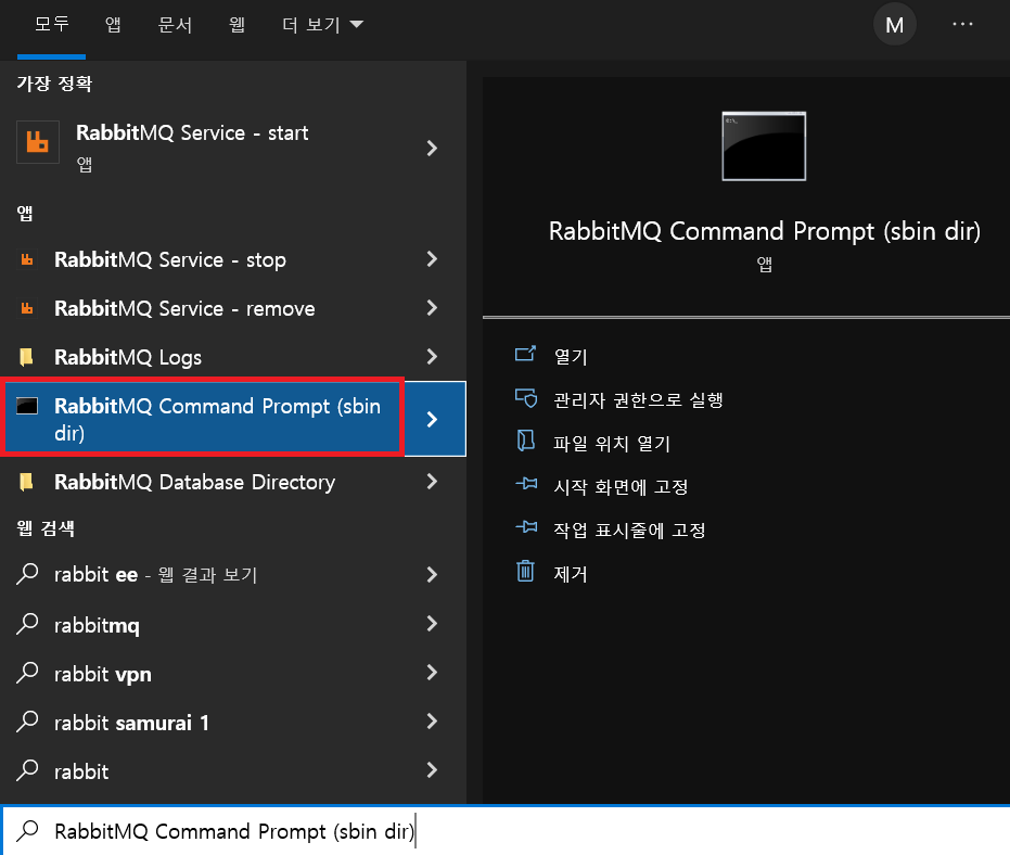 시작에서 rabbitMQ를 검색하고 관리자 권한으로 실행한다. 활성화를 시킵니다.