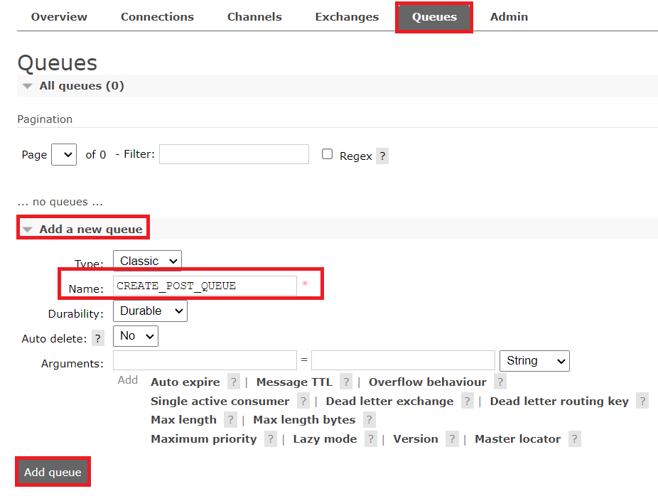 Queues 탭으로 이동해서 Add a new queue를 선택해 새로운 큐를 만든다. 이름은 CREATE_POST_QUEUE로 합니다.