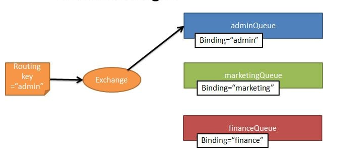 라우팅 키에 근거해 메세지는 binding 규칙에서 정해진 라우팅 키를 가진 queue로 이동됩니다. exchange의 라우팅 키와 binding queue는 완전히 동일해야 합니다. 메세지는 정확히 하나의 queue로만 이동합니다.