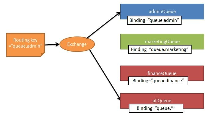 라우팅 키가 사용되지만, direct exchange와는 다르게 exchange와 queue의 라우팅 키들이 무조건 완벽하게 동일해야 할 필요가 없습니다. 와일드카드 같은 일반 정규식을 사용해서 exchange에서 여러개의 queue에 전송할 수 있습니다.