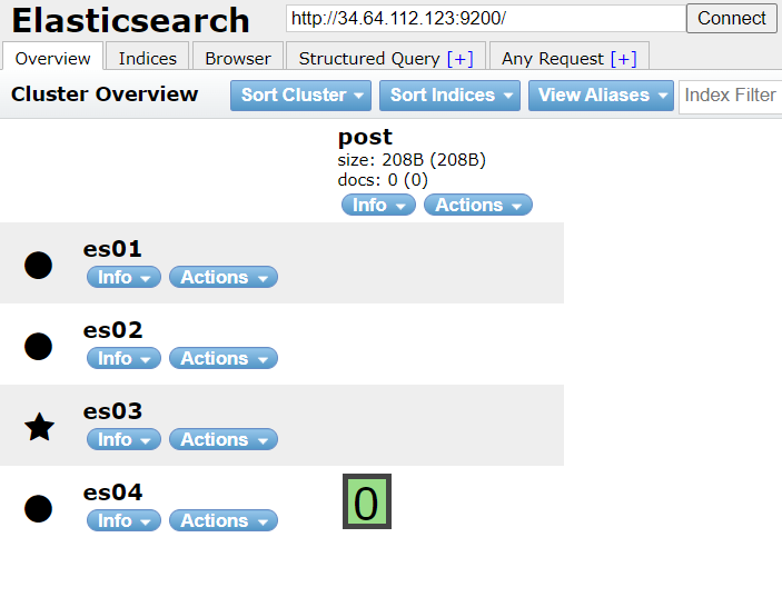 Shards는 1, Replicas는 0으로 생성합니다. Shards의 갯수에 따라서 0번부터 시작이 되고, es04에 만들어졌음을 알 수 있습니다.