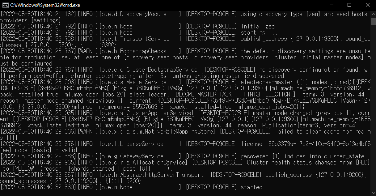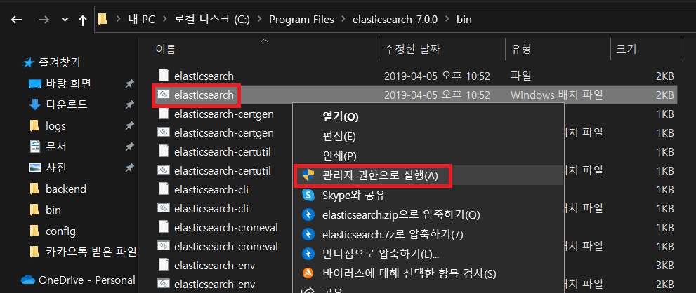 elasticsearch 폴더의 bin에서 elasticsearch를 관리자 권한으로 실행합니다.