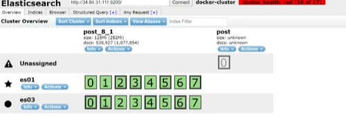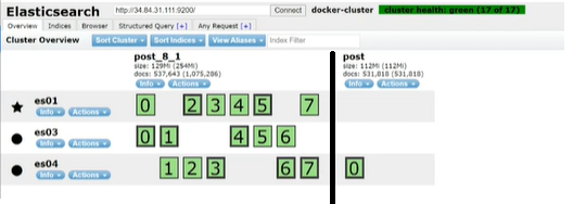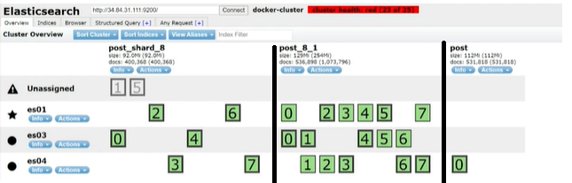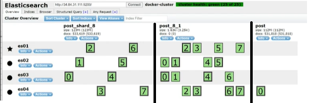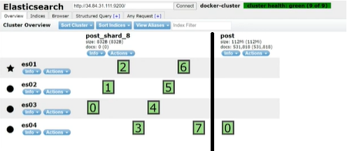 예를들어, 노드는 4개, 샤드는 8개를 가지는 Indicies를 생성합니다. (post_shard_8)