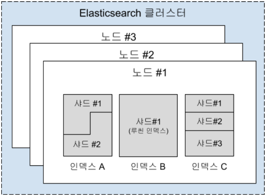document의 집합체인 인덱스는 기본적으로 한 개 혹은 여러개의 샤드(shard)라는 단위로 분리됩니다. 샤드는 내부적으로는 루씬(Lucene)의 Index와 대응됩니다. 이 인덱스들은 한 개 혹은 여러 개가 모여서 노드를 구성합니다. 노드들이 모여 전체 클러스터를 구축합니다.