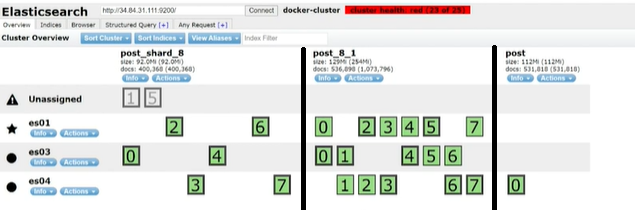 예를들어, 노드는 4개, 샤드는 8개를 가지는 Indicies를 생성합니다. (post_shard_8)