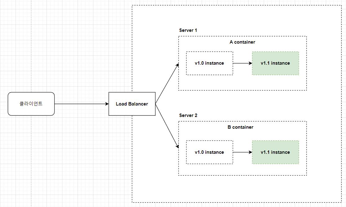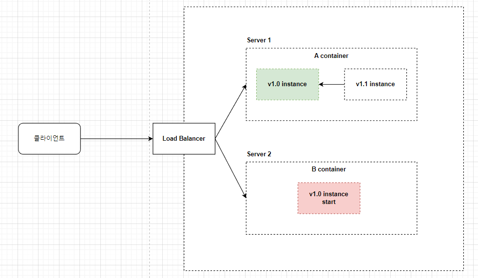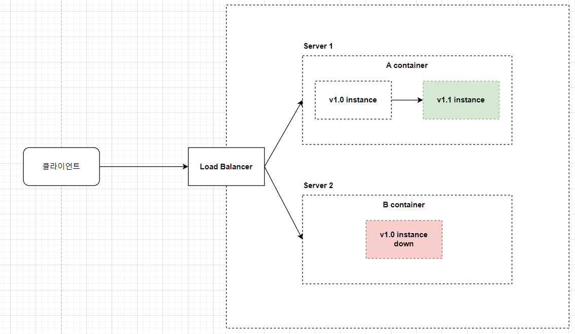 만약 A 컨테이너만 띄운 상태에서 문제가 생기는 경우, A컨테이너를 다시 내리고 B 컨테이너만 서비스에 운영합니다. 그리고 A를 롤백시키고 다시 재기동합니다. 이후 코드를 수정하고 다시 배포 과정을 거칩니다.