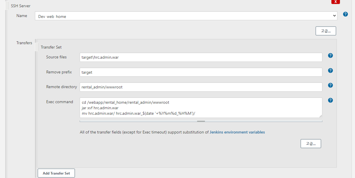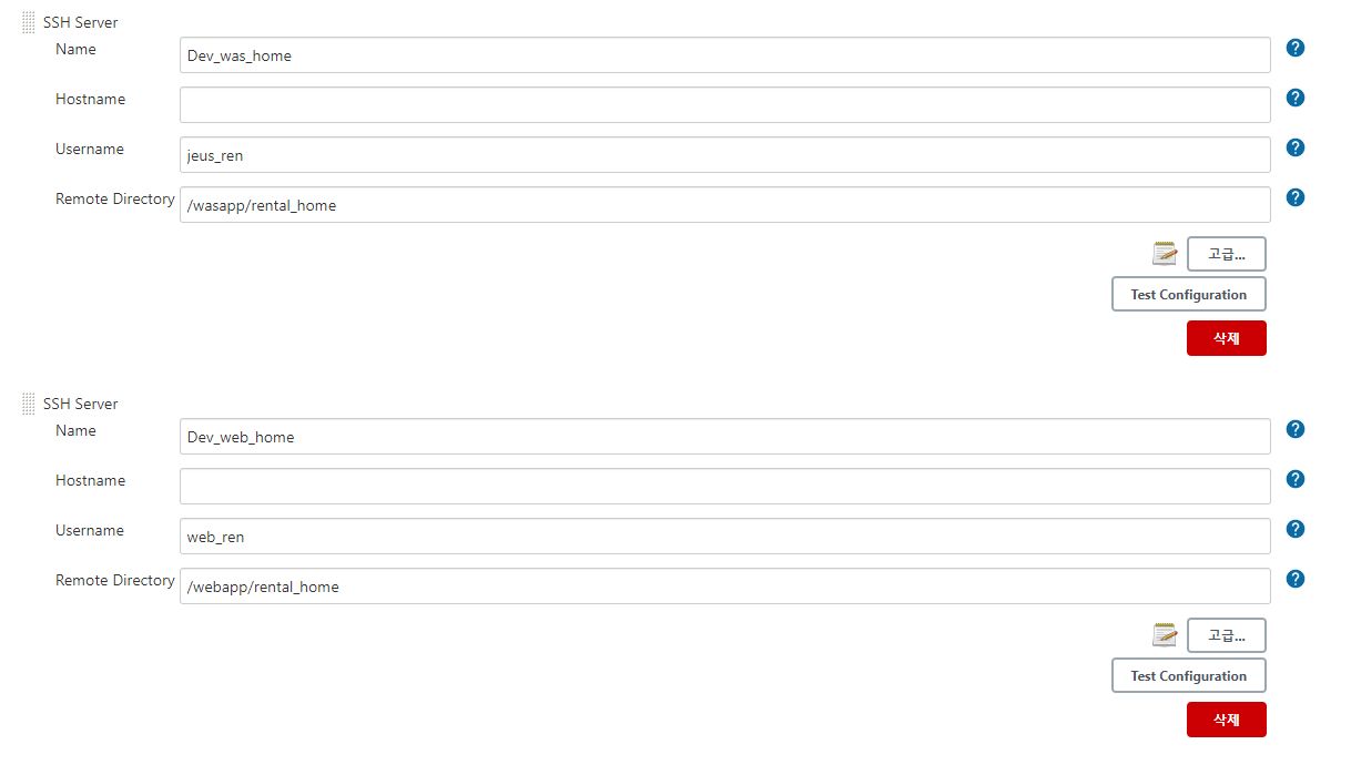 맨 하단에 Publish over SSH를 선택해서 SSH 서버를 연결합니다. front, admin의 was, web 각각 2개를 연결합니다.