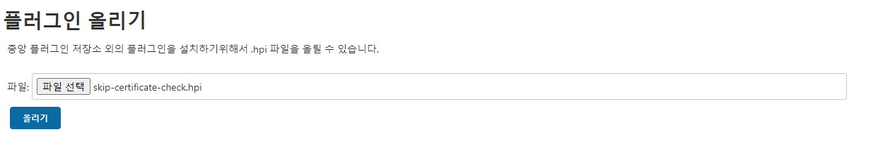 SSL을 스킵하는 플러그인(skip-certificate-check.hpi)을 수동으로 다운로드하여서 젠킨스 plugin 폴더에 넣고 재시작합니다.