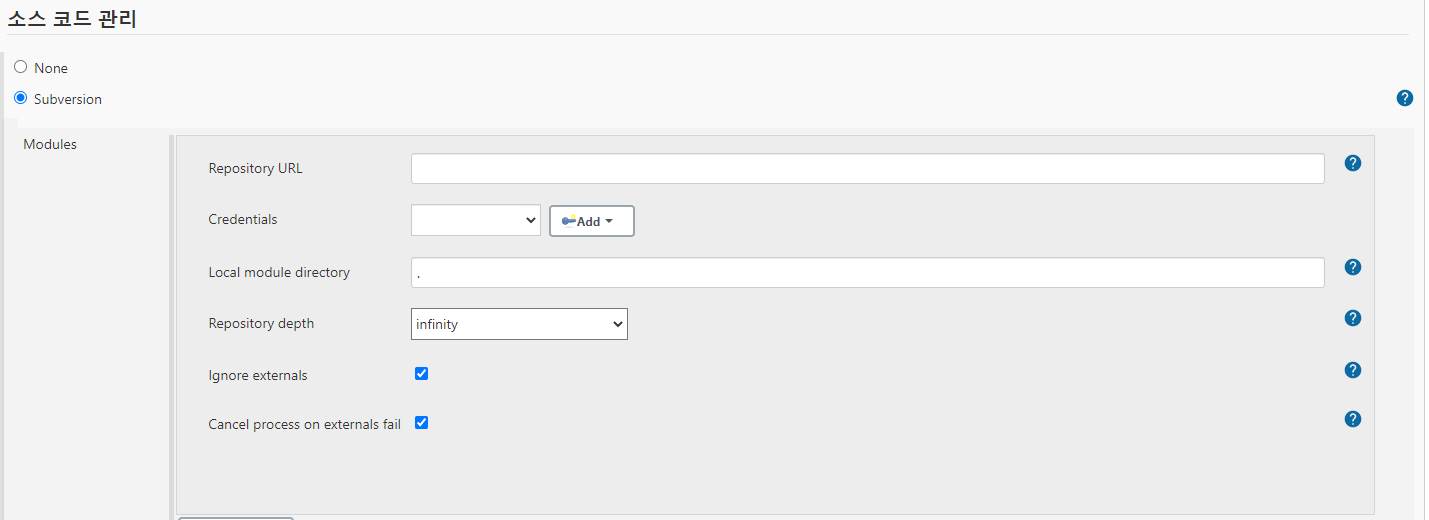 기본적인 환경 세팅이 끝났으면, 소스코드 관리, 빌드, 빌드 후 조치를 설정합니다. svn을 사용하여 maven으로 빌드하고, 각 서버의 경로에 따라서 빌드된 파일들을 이동시킵니다.