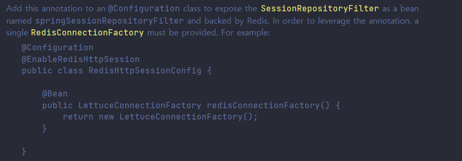 @EnabledRedisHttpSession을 통해 Redis 세션 사용을 설정합니다. 아래 주석에 따르면, @Configuration으로 빈을 등록하는 곳에 @EnableRedisHttpSession을 사용합니다. springSessionRepositoryFilter라고 이름붙여진 SessionRepositoryFilter를 구현하여 빈을 생성하며 Spring Session을 Redis에서 이용할 수 있습니다.