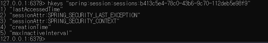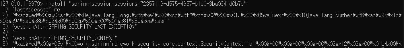 해당 데이터는 hash 저장소이므로 hgetall을 이용해 조회하면, 각 hash key에 따른 값들을 조회할 수 있습니다.