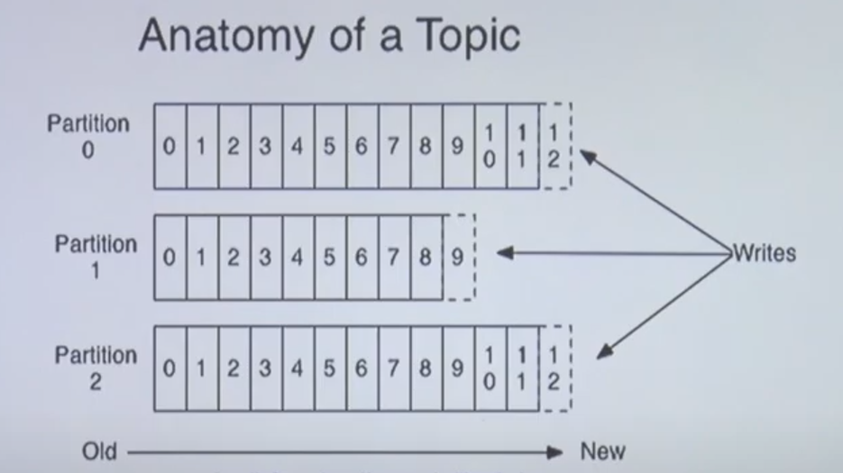 Kafka는 큐를 구현하지 않습니다, 대신에 토픽(topic)라고 불리는 카테고리에 데이터 집합을 저장합니다. 각각의 토픽에, Kafka는 분할된 메세지 로그를 가지고 있습니다. 하나의 토픽에 하나의 파티션 혹은 여러개의 파티션을 가질 수 있습니다. 각 파티션은 메세지가 지속적으로 추가되며 데이터 순서가 정해져있고, 내용이 바뀌지 않습니다.