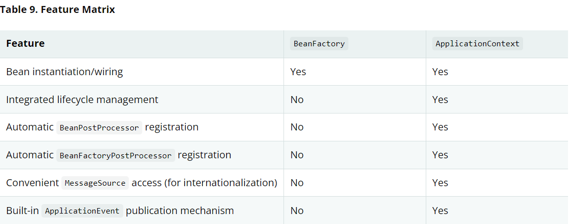In short, the BeanFactory provides the configuration framework and basic functionality, and the ApplicationContext adds more enterprise-specific functionality. The ApplicationContext is a complete superset of the BeanFactory and is used exclusively in this chapter in descriptions of Spring’s IoC container. For more information on using the BeanFactory instead of the ApplicationContext, see the section covering the BeanFactory API.