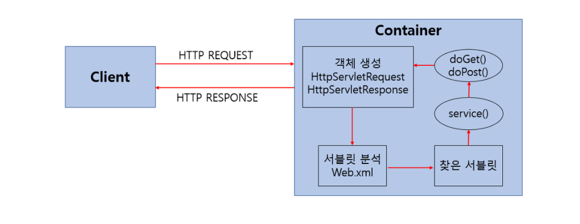 사용자는 단순히 서버로부터 정적이 페이지만 요청할 수 있었지만, 사용자는 입력 값에 따른 웹 페이지를 확인하고 싶었습니다.따라서, 서블릿 컨테이너를 통해 자바를 이용해서 서버쪽에서 웹페이지를 동적으로 생성하도록 발전했습니다. 따라서 서블릿 컨테이너는 서블릿을 상호작용 시키는 웹 서버의 일부분 입니다. 서블릿 컨테이너는 웹 서버의 한 부분으로 분리되어 프로세스로 실행될 수 있습니다.