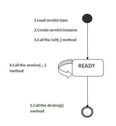 서블릿은 3가지 상태가 있습니다. new, ready, end. 서블릿은 서블릿 객체가 생성되면, new 상태가 됩니다. init() 메서드라 호출되고나면, 서블릿은 ready 상태가 됩니다. 이 상태에서 service()의 모든 작업을 수행합니다. 웹 컨테이너가 destory() 메서드를 호출하면, end 상태로 전환됩니다.
