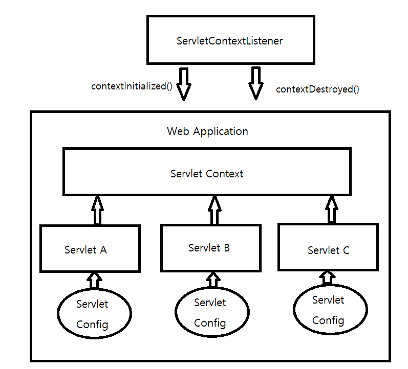 사진에서처럼, Servlet A,B,C 등 여러개의 서블릿이 있는데 이는 Servlet Config라는 설정정보가 있고 모두 서블릿 컨텍스트에서 공유가 됩니다. WAS는 서블릿을 생성하기 전에 ServletContext클래스를 먼저 생성하고, ServletContextListener를 생성한 후 컨텍스트 초기화 이벤트인 contextinitialized() 함수를 실행합니다.