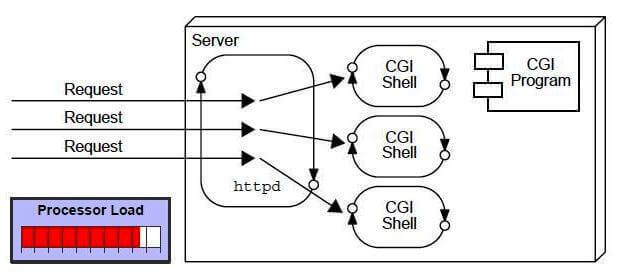 하지만 CGI의 단점이 있는데, 사용자가 증가하면 응답하기 위한 시간이 길어집니다. 또한, 요청마다 프로세스를 할당하기 때문에 웹 서버는 프로세스 작업에 제한이 많습니다. C, C++, perl 같은 플랫폼 종족적인 언어를 사용합니다.