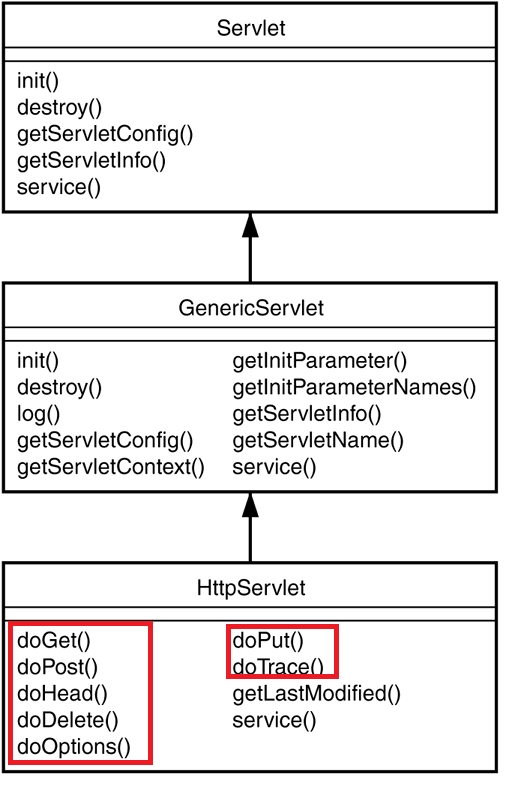 HttpServlet 클래스는 GenericServlet 클래스를 상속하고 Serializable 인터페이스를 구현합니다. doGet, doPost, doHead, doTrace와 같은 http 특화된 메서드를 제공합니다.