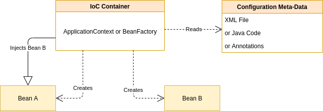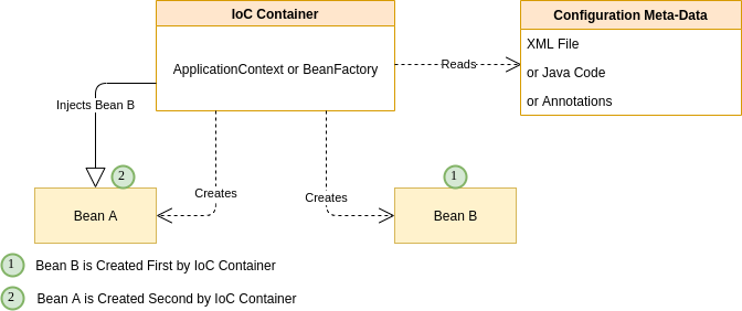 아래 사진을 보면 알 수 있습니다. 만약에 A가 B를 의존한다면, 먼저 B가 컨테이너에 의해 초기화가 되고 그 이후에 B를 A에 주입하여 A를 초기화합니다.
