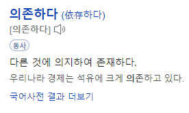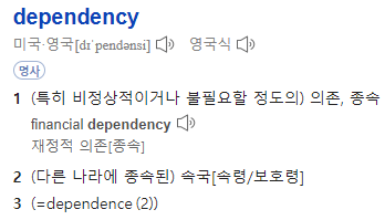 영어사전을 보면, 불필요할 정도의 종속을 말하기도 합니다. 한국어를 보면, 다른 것에 의지하여 존재하는 것입니다. 즉, 혼자서는 독립적으로 존재하지 못하고 다른 요소에 도움을 받아야만 존재할 수 있는 성질로 추측해볼 수 있습니다. 우리나라의 경제가 석유가 없으면 안 되기에 석유에 의존하여 많은 산업을 가동하는 것처럼 스프링에서도 객체들은 서로 의지하여 존재하는 관계입니다.