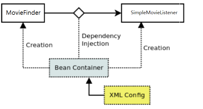 스프링 컨테이너가 생성되어 초기화 되면, 스프링 컨테이너는 설정 정보에 따라 빈을 생성하고 관리합니다. (위의 예시 코드에는 없지만 아마 MovieFinder는 스프링 컨테이너에 의해 빈으로 관리되고 있는 상황이라고 추측 가능합니다.) private final MovieFinder movieFinder로 선언된 변수가 있으며, SimpleMovieListener 생성자에 MovieFinder가 매개변수로 있기 때문에, "movieFinder는 SimpleMovieListener에 의존성이 주입"됩니다.