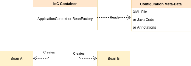컨테이너는 자동으로 이 의존성들의 인스턴스들을 런타임에 제공해주며, 생명주기까지 관리합니다. 관리는 스프링 컨테이너가 하기 때문에, 개발자는 어떤 것을 빈으로 관리하고 어떻게 의존성 주입을 할 것인지만 고민하면 됩니다.