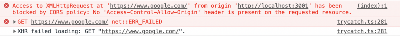 만약 서버 응답에 access-control-allow-credentials 가 true로 설정되지 않았거나 access-control-allow-origin 헤더에 있는 값이 허용된 출처가 아니라면 아래와 같이 오류가 발생합니다.