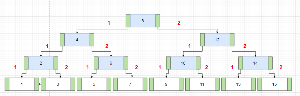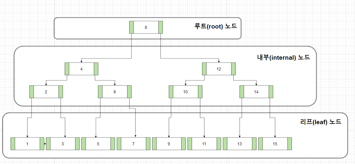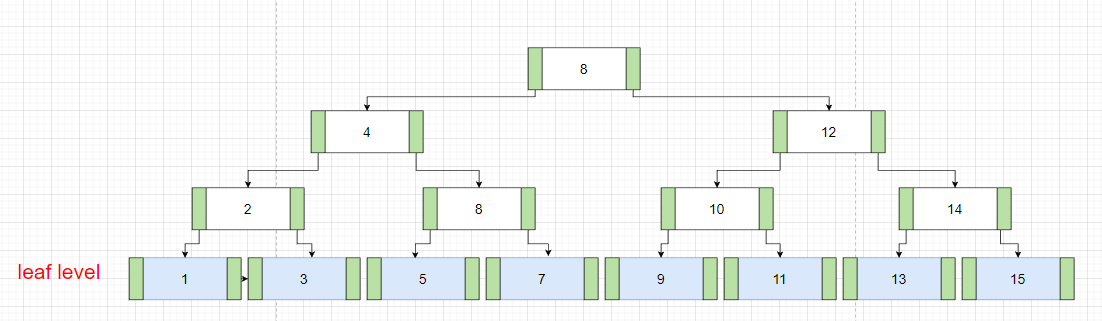- 모든 리프 노드들은 링크드 리스트 형태로 이어져있다.