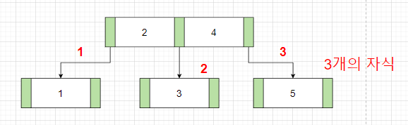 아래 사진처럼, B-tree는 3개의 값, 4개의 자식이 있을 수 있습니다.