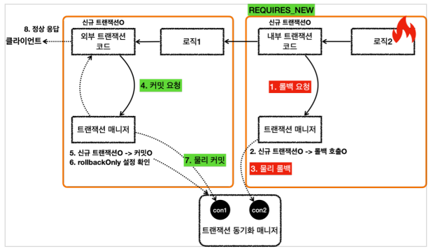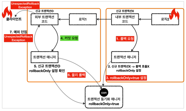 외부 트랜잭션의 경우 실제 커밋을 호출하기 위해 트랜잭션 동기화 매니저에서 커넥션을 획득해야 하는데 rollbackOnly=true로 표시되어 있기 때문에 커밋을 하지 못하고 롤백을 합니다. 또한 단순히 롤백 할 뿐만 아니라 UnexpectedRollbackException을 던집니다. 시스템 입장에서는 커밋을 호출했지만, 롤백이 되었다는 것을 명확히 알려주기 위함입니다.