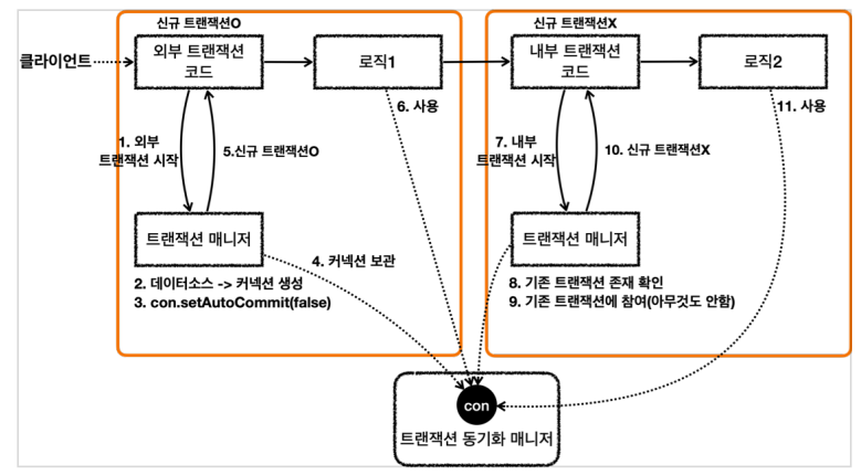 외부 트랜잭션코드가 실행되고 이어서 내부 트랜잭션 코드가 실행됩니다. 외부 트랜잭션 코드는 이전에 스프링 트랜잭션 작동 원리 순서와 동일합니다. 내부 트랜잭션의 경우(REQUIRED) 신규 트랜잭션을 시작하지 않고 기존 트랜잭션이 있으면 기존 트랜잭션에 참여합니다. 트랜잭션 동기화 매니저에 외부 트랜잭션 로직을 수행했던 커넥션이 보관되어 있습니다. 이 커넥션을 내부 트랜잭션에서 그대로 사용합니다.
