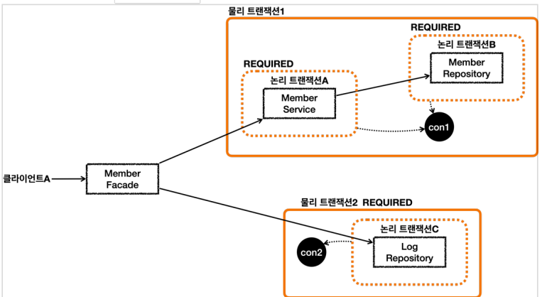 - 모든 논리 트랜잭션이 커밋 되어야 물리 트랜잭션이 커밋됩니다.
