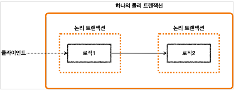 스프링은 이해를 돕기 위해서 각 로직에 있는 트랜잭션은 논리 트랜잭션, 논리 트랜재션들을 묶어 하나의 물리 트랜잭션이라 합니다. 논리 트랜잭션은 트랜잭션 동기화 매니저를 통해 트랜잭션을 사용하는 단위입니다. 물리 트랜잭션이 실제 데이터베이스에 적용되는 단위입니다.