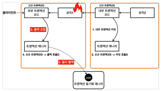 내부 트랜잭션이 롤백되면 물리 트랜잭션은 전체 롤백됩니다. 단, 이 경우에는 외부 롤백 트랜잭션보다 조금 더 복잡합니다.