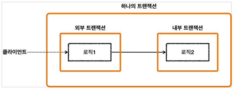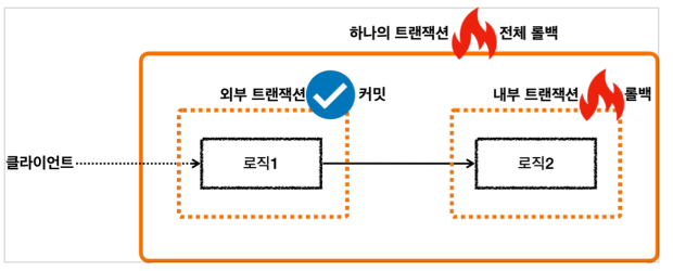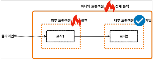 외부 트랜잭션 내에 내부 트랜잭션이 있는 경우, 전체는 크게 하나의 트랜잭션으로 묶입니다.